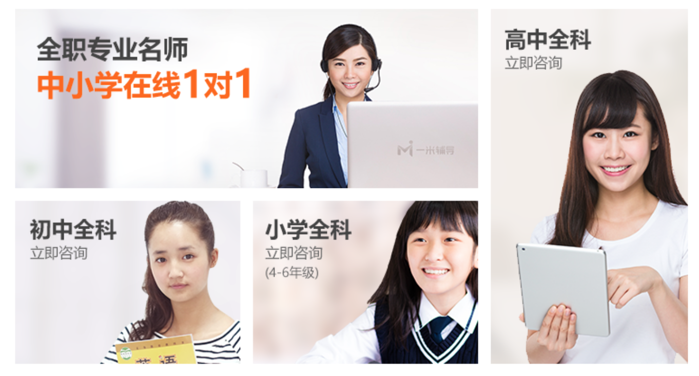 為強(qiáng)調(diào)與學(xué)生的互動(dòng)性,一米輔導(dǎo)全部采用一對(duì)一“在線+直播”模式。課程包括小學(xué)4-6年級(jí)、初中、高中全科內(nèi)容,并推出“四次課不滿意全額退款”的服務(wù)。