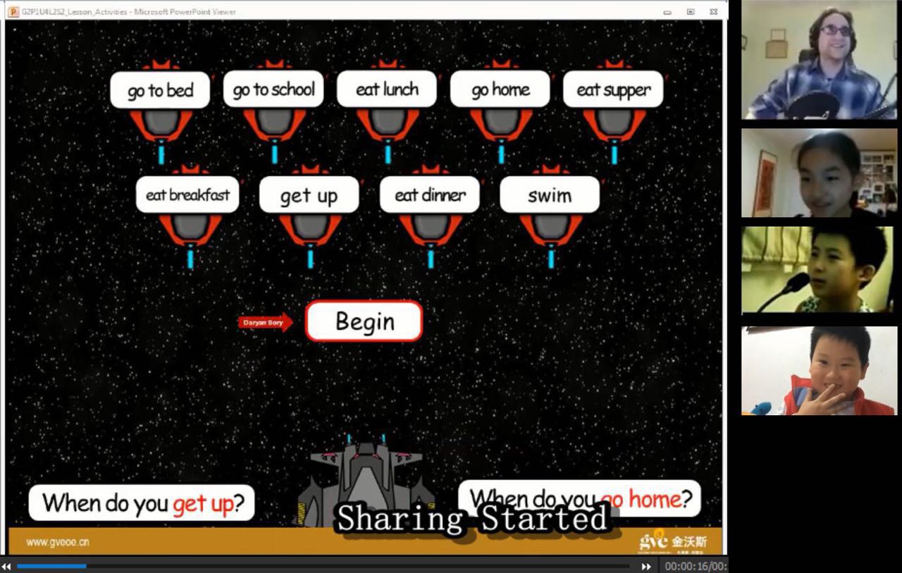 第二,游戲化、競賽化的學習方式。“游戲即學習,學習即游戲?!?/strong>唐振華在采訪過程中多次強調(diào)。游戲是金沃斯學習的一種載體。在多知網(wǎng)看到的教學視頻中,一個班3個學生,玩的是“飛行游戲”:每一個目標上有英文單詞或詞組,當學生念出游戲中的單詞或詞組的時候,意味著目標被消滅,老師會點擊那個目標。幾個學生一起比賽,爭先恐后讀出目標上的單詞或詞組,學習熱情高漲。