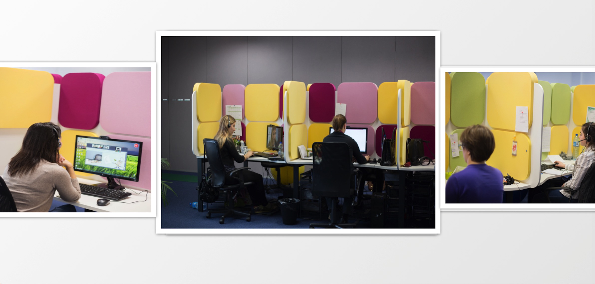 這是我們基地的樣子,現(xiàn)在基地有1600多平米,100多名老師。每一個(gè)工位的設(shè)置都是這樣的,配備專(zhuān)業(yè)的隔音材料和吸音海綿,老師都會(huì)有自己的封閉空間來(lái)上課。工位的隔板比普通工位要高很多,也會(huì)比桌子往后延伸出一截,這些全部是定制的,因?yàn)榭梢愿糸_(kāi)老師彼此之間的聲音干擾。這個(gè)基地是我們自己一草一木、一針一線搭起來(lái)的,每一個(gè)細(xì)節(jié)都是從老師和授課體驗(yàn)出發(fā)去設(shè)計(jì)的。