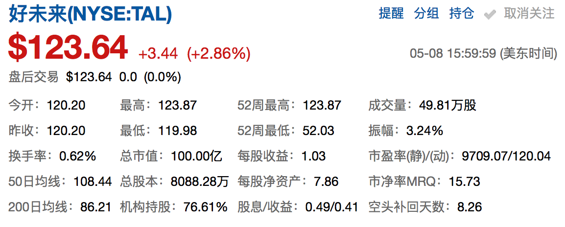 好未來(lái)股價(jià)達(dá)123.64美元,成為第二支市值破百億美元的教育股。
