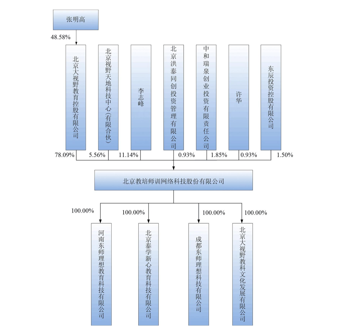 張明高為教師網(wǎng)的實(shí)際控制人。公告披露,大視野持有股權(quán)比例為78.09%,張明高持有大視野的股權(quán)比例為48.58%;視野天地持有股權(quán)比例為 5.56%,張明高對(duì)視野天地的出資份額占51%。因此,張明高先生通過(guò)大視野和視野天地控制教師網(wǎng)83.65%的股權(quán),并且張明高先生擔(dān)任教師網(wǎng)的董事長(zhǎng),擔(dān)任大視野的董事長(zhǎng)、總經(jīng)理及法定代表人,以及視野天地執(zhí)行事務(wù)合伙人,實(shí)際控制公司的發(fā)展方向。