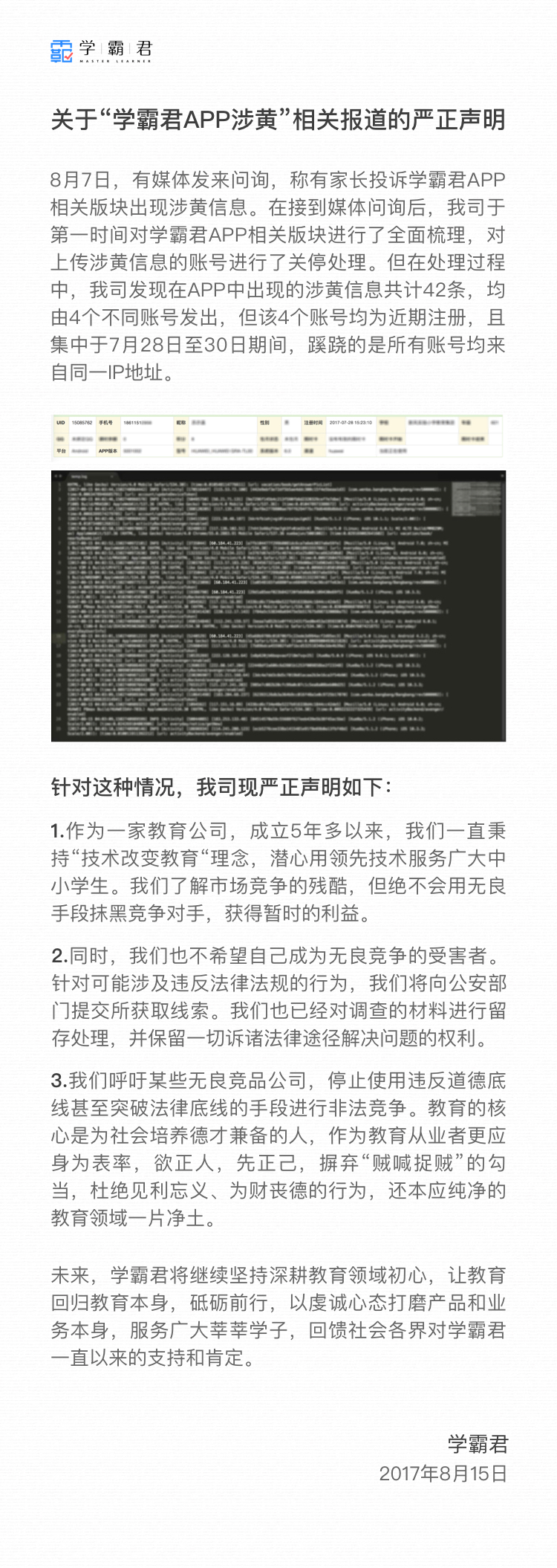 多知網(wǎng)8月15日消息,今日,學(xué)霸君對APP涉黃事件發(fā)布聲明。聲明稱,APP中出現(xiàn)的共計42條涉黃信息,均來自4個近期集中注冊的不同賬號,且所有賬號均來自同一IP地址,初步懷疑是競爭對手惡意攻擊。