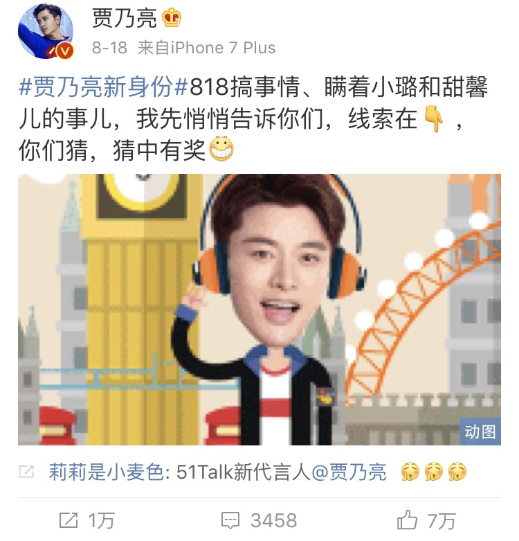 兩天前在賈乃亮官方微博就有一段#賈乃亮新身份#的內(nèi)容發(fā)布出來,而有評論直接“劇透”其將成為51Talk最新代言人。剛剛51Talk方面也已證實(shí)了這個(gè)猜測。