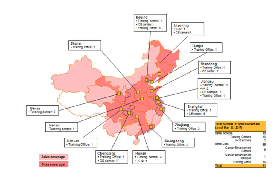 從安博的機(jī)構(gòu)分布來看,截至2017年3月31日,安博共有學(xué)習(xí)中心和學(xué)校41個(gè),其中3所直營(yíng)K12學(xué)校;10所培訓(xùn)中心,28所職業(yè)發(fā)展中心,包括9所職業(yè)技能培訓(xùn)中心,18所培訓(xùn)辦公室,1所職業(yè)訓(xùn)練營(yíng)。