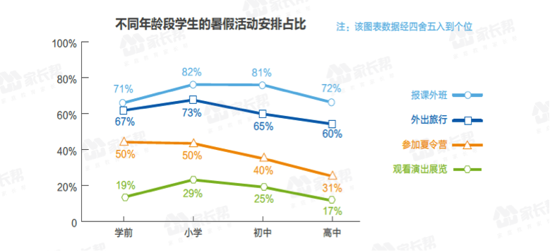 調(diào)查問卷中,約有近八成的家長為孩子選擇了文化輔導班,七成左右的家長會陪伴孩子暑期旅行。