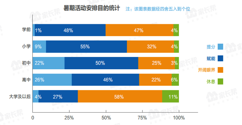 報告中顯示,無論孩子就讀于哪個年級,家長們均以“賦能”或“開闊眼界”作為孩子假期活動安排的最主要目的,即使面臨升學壓力的高中生,家長們也期待孩子可以通過假期提升綜合能力。