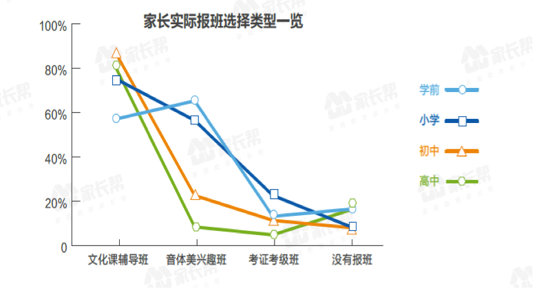 從年齡對比來看,小學、初中的孩子家長為孩子選擇文化課補習的比率較學前、高中孩子高出一成。