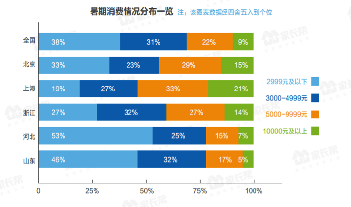 根據(jù)全國各主要城市的暑期消費分布數(shù)據(jù),在孩子的暑假教育投入中,花費超萬元的城市占少數(shù)。上海比率最高,達到21%。大多數(shù)家長的消費則在5000元以下,河北省在教育投入上低于3000的家庭超過一半。