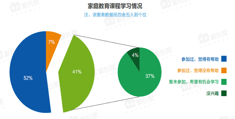 在家庭教育相關課程的學習上,多數(shù)家長會傾注大量的時間陪伴孩子,有超過三分之一的家長甚至能夠做到全天陪伴。