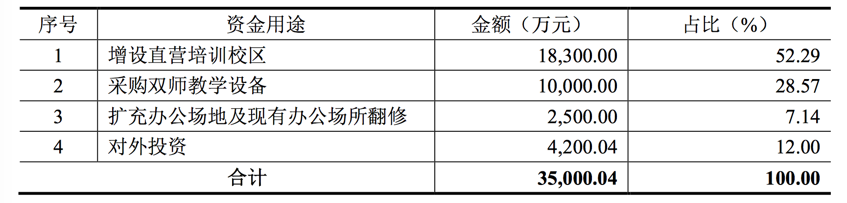 公告披露,本次股票發(fā)行募集資金扣除發(fā)行費用后,主要用于增設(shè)直營培訓(xùn)校區(qū)、采購雙師教學(xué)設(shè)備、擴(kuò)充辦公場地及現(xiàn)有辦公場所翻修和對外投資等。資金用途擬安排如下: