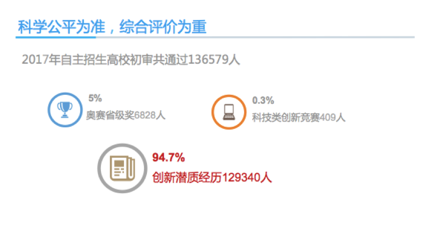 A:每年所有的學校的初審規(guī)模我們都知道,他們的條件標準是很清楚的,其中有兩個類型的條件對應的每年人數也是固定的,競賽獲獎、科技類獎項這兩個數據是固定的,剩下都是其他類型,其他類型主要就是創(chuàng)新潛質這個類型,我們用公式計算就可以知道一個精確的數字。(多知網 Alvin)