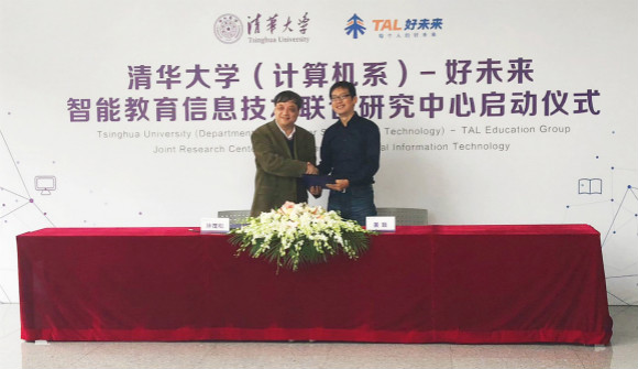 清華大學(xué)計(jì)算機(jī)系黨委書記孫茂松和好未來(lái)CTO黃琰簽署合作協(xié)議
