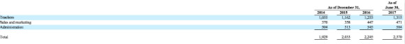 在人員結(jié)構(gòu)上, 瑞思職員類型主要分為教師、銷售和市場(chǎng),截至2017年上半年,共計(jì)員工2370人,其中教師人數(shù)為1315名,銷售人員471人,市場(chǎng)投放人員584人。