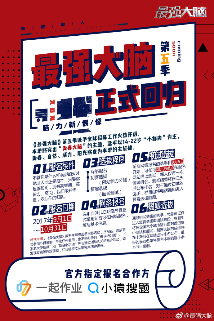 2017年9月,《最想大腦》第五季選手招募。不同于往期的賽制,節(jié)目組對(duì)外直接公布了報(bào)名方式,采用海選模式,而在其宣傳海報(bào)上還標(biāo)注著:官方指定報(bào)名合作方——一起作業(yè)、小猿搜題。