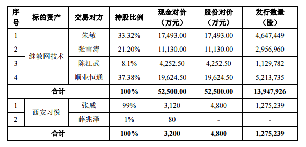 其中,收購繼教網(wǎng)100%股權(quán)的股份支付對價(jià)共計(jì)為5.25億元,根據(jù)發(fā)行價(jià)格37.64元/股計(jì)算,向朱敏、張雪濤、陳江武和順業(yè)恒通4名交易對方共發(fā)行股份1394萬股。收購西安習(xí)悅100%股權(quán)的的股份支付對價(jià)共計(jì)為4800萬元,根據(jù)發(fā)行價(jià)格37.64元/股計(jì)算,向交易對方張威共發(fā)行股份127萬股。