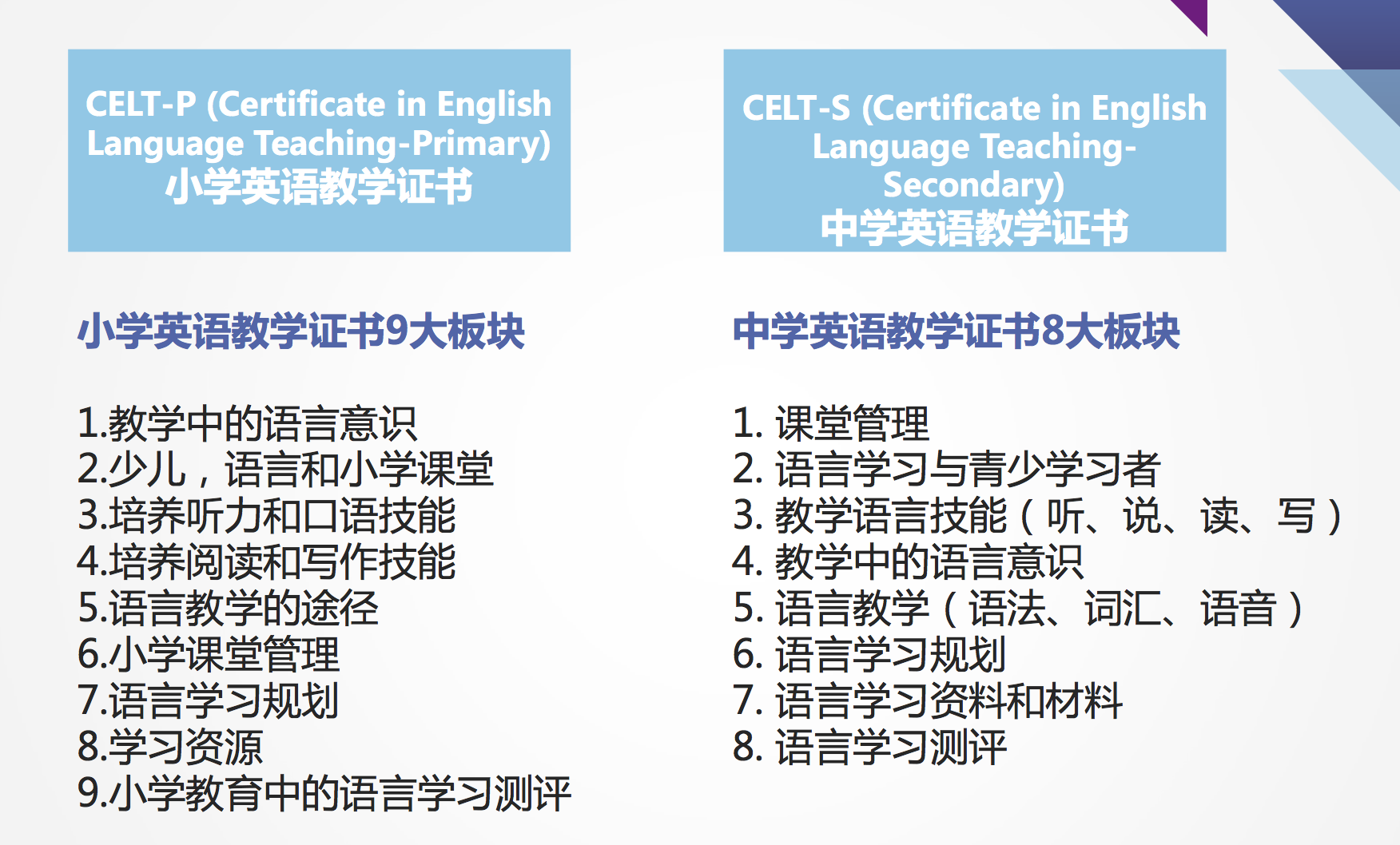 針對(duì)小學(xué)和中學(xué)英語(yǔ)教學(xué),新東方分別推出了CELT-P、CELT-S課程。CELT-P、CELT-S課程都包含120小時(shí)的在線課程和面授教學(xué)實(shí)踐。