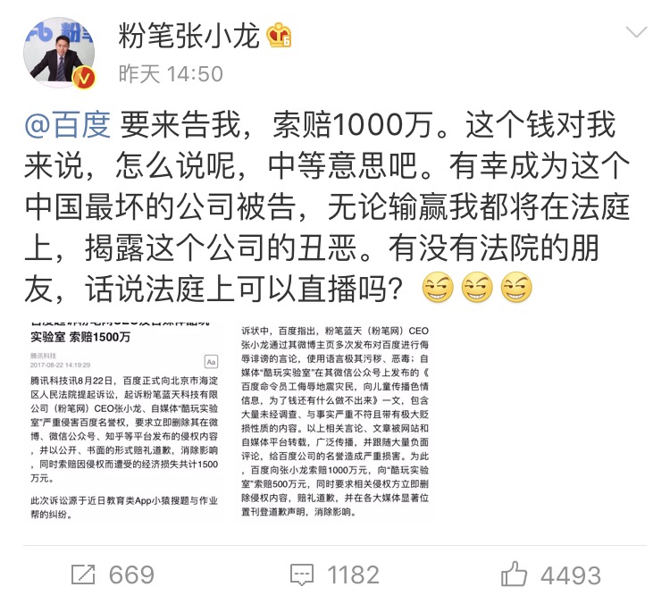 8月21日下午2點(diǎn),百度通過三方宣布,向北京市海淀區(qū)人民法院提起訴訟,起訴粉筆科技CEO張小龍、自媒體 “酷玩實(shí)驗室”嚴(yán)重侵害百度名譽(yù)權(quán)。并向張小龍、“酷玩”共計索賠1500萬元。
