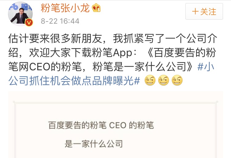 下午4點(diǎn),張小龍在微博上發(fā)出《百度要告的粉筆網(wǎng)CEO的粉筆,粉筆是一家什么公司》的品牌文案,鼓勵看客們與其關(guān)注事件本身,不如下個粉筆App。