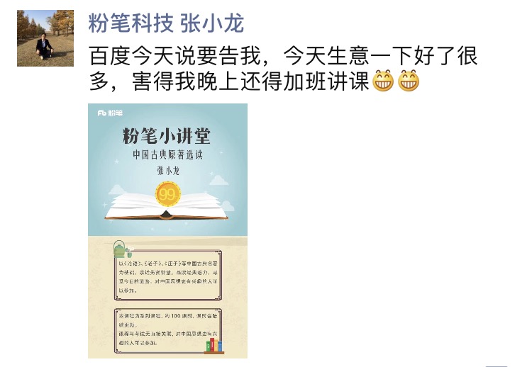 下午7點(diǎn)半,張小龍再次發(fā)微信:“因為百度的折騰,讓他學(xué)員多了不少,還得加班講課?!笔潞笄笞C此事時,他透露雖無法給出因為這場大戲而為粉筆帶來的直接效益,但是他的微博粉絲,的確又漲了不少。