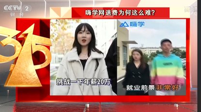 央視表示,很多學(xué)員都陷入了交錢容易、退錢難的境地。僅315晚會的郵箱就收到了數(shù)百封嗨學(xué)網(wǎng)的投訴郵件。