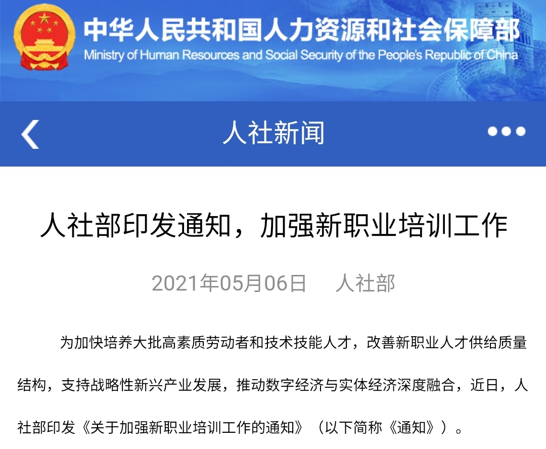 多知網(wǎng)5月7日消息,近日,人力資源和社會(huì)保障部印發(fā)《關(guān)于加強(qiáng)新職業(yè)培訓(xùn)工作的通知》(以下簡稱《通知》)。旨在加快培養(yǎng)大批高素質(zhì)勞動(dòng)者和技術(shù)技能人才,改善新職業(yè)人才供給質(zhì)量結(jié)構(gòu),推動(dòng)數(shù)字經(jīng)濟(jì)與實(shí)體經(jīng)濟(jì)深度融合。