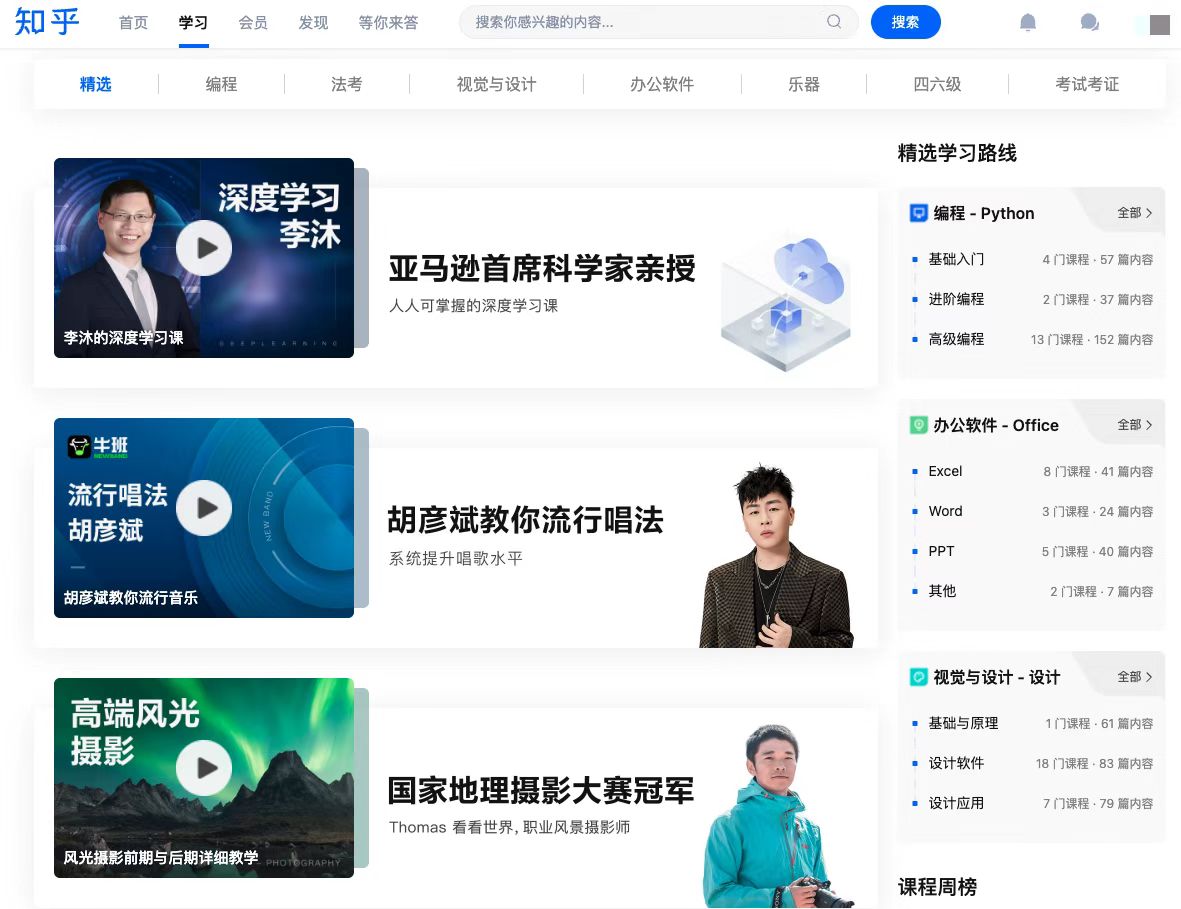 多知網6月29日消息,知乎近日正式上線“學習”專區(qū),同步上線數百門免費正版授權課程,覆蓋編程、法考、辦公軟件、樂器、四六級、視覺設計等多個行業(yè)領域。