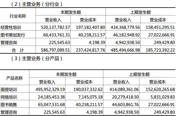 主營(yíng)業(yè)務(wù)按行業(yè)劃分,經(jīng)營(yíng)性培訓(xùn)營(yíng)收5.2億元,營(yíng)業(yè)成本1.97億元;圖書策劃發(fā)行6643萬(wàn)元,營(yíng)業(yè)成本4023萬(wàn)元;管理咨詢營(yíng)收22.5萬(wàn)元,營(yíng)業(yè)成本4198元。