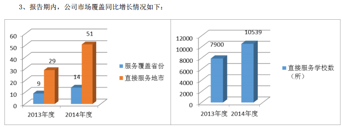 報告期間,全課網(wǎng)平臺注冊學校數(shù)從44000所增長到48000所,平臺注冊用戶數(shù)從2500萬增長到3500萬,用戶增長率達40%,覆蓋省份從9個省增長至14個省,新增山東、甘肅、河北、四川、江西5省。服務(wù)地級城市從29個增長到51個。2014年度公司業(yè)績實現(xiàn)穩(wěn)定增長,營業(yè)收入19,257.38萬元,比上年同期增長11.80%,合并凈利潤4,487.74萬元,比上年同期增長6.87%。