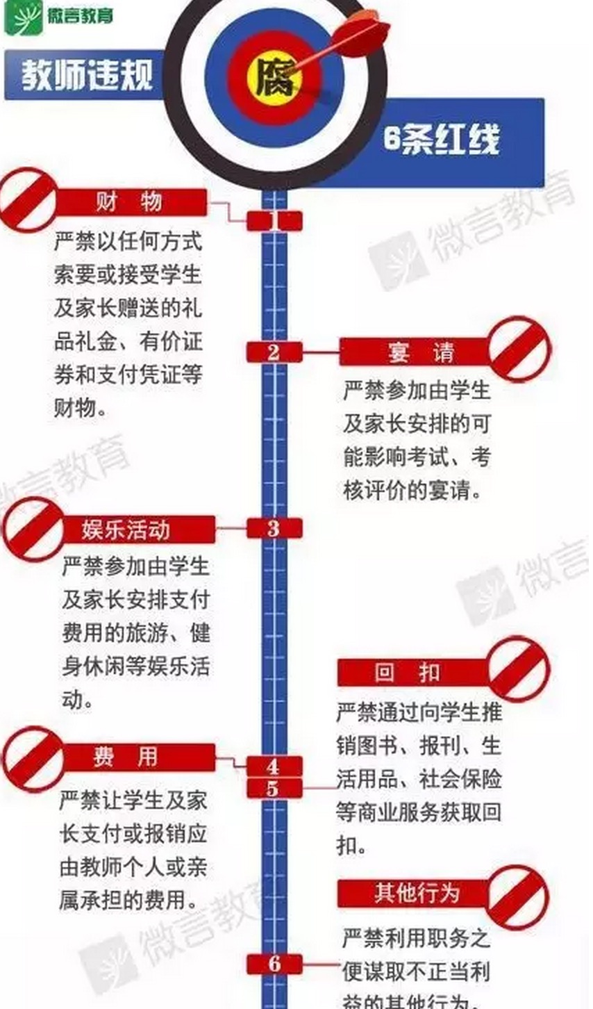 據(jù)悉,2014年7月,教育部印發(fā)《嚴禁教師違規(guī)收受學(xué)生及家長禮金等行為的規(guī)定》,文件明確了6條“紅線”,其中包括嚴禁教師以任何方式索要或接受學(xué)生及家長贈送的禮品禮金、有價證券和支付憑證等財物。