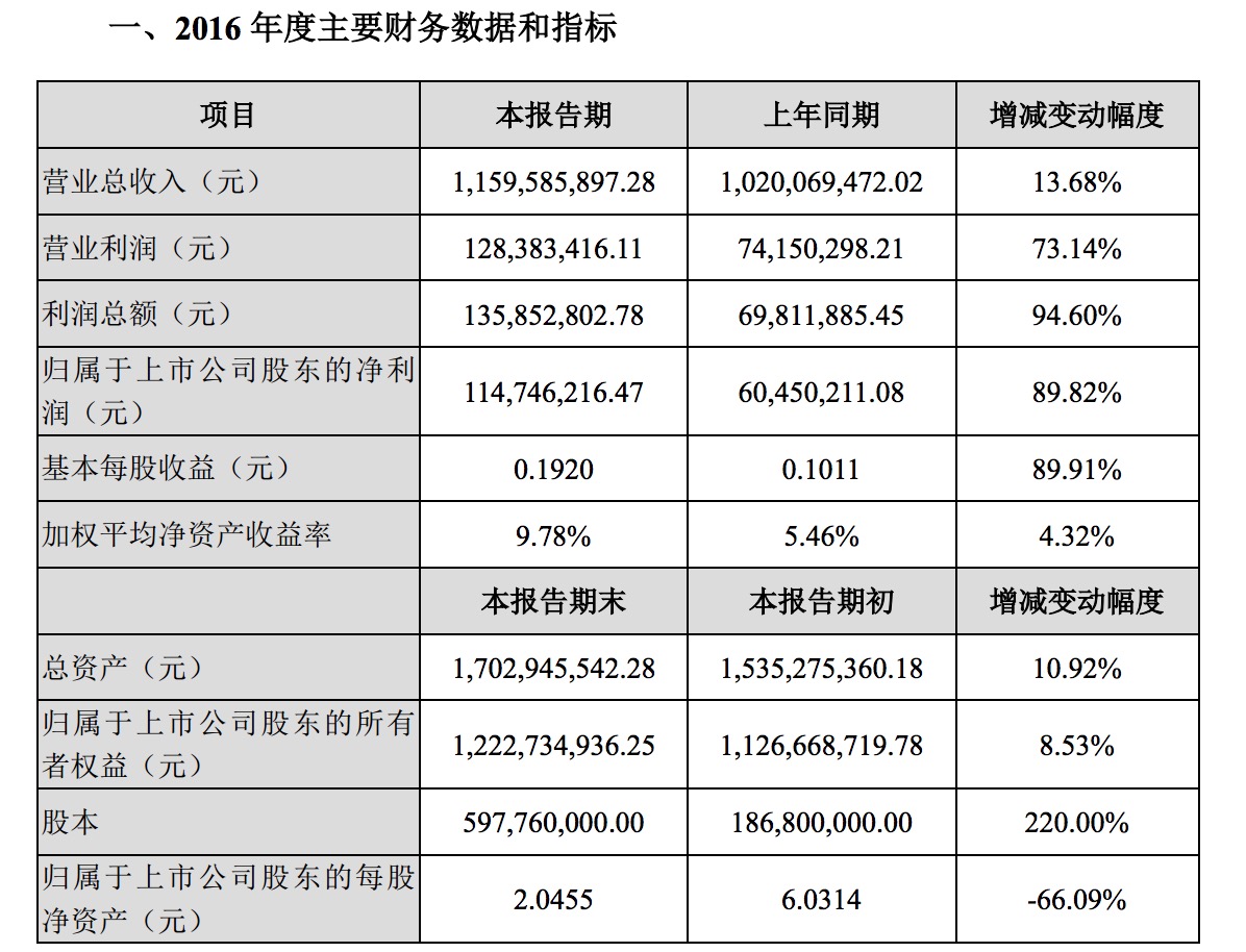 報(bào)告顯示,2016 年度公司營業(yè)收入為 11.60億元,較上年同期增長 13.68%;營業(yè)利潤為1.28億元,較上年同期增長73.14%;利潤總額為1.36億元,較上年同期增長94.60%;歸屬于上市公司股東的凈利潤為1.15億元,較上年同期增長89.82%。