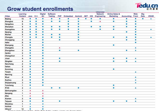 產(chǎn)品線的擴張,從IPO時候的11門課程增加到18門課程,尤其是IT產(chǎn)品線的拓張非常成功,web前端、大數(shù)據(jù)、VR/AR課程都緊跟市場需求;非IT類課程,UI是達內(nèi)這些年最成功的一個產(chǎn)品線,2013年推出以后到現(xiàn)在已經(jīng)成為招生最多的課程,但UI仍然是和IT行業(yè)高度相關(guān)的職業(yè),達內(nèi)上市后一直想在IT以外找到新的增長點,2014年推出的會計課程,曾經(jīng)被寄予厚望,并且在2015年擴張到了十幾個城市,公司在財報里也多次提及,但是2016年沒有新增一個教學點,而且公司也怎么不在財報里提會計業(yè)務(wù)了,不知道這塊業(yè)務(wù)是不是遇到什么瓶頸?有待核實。