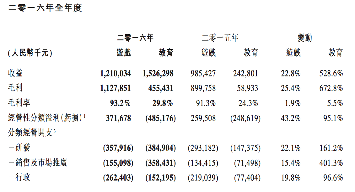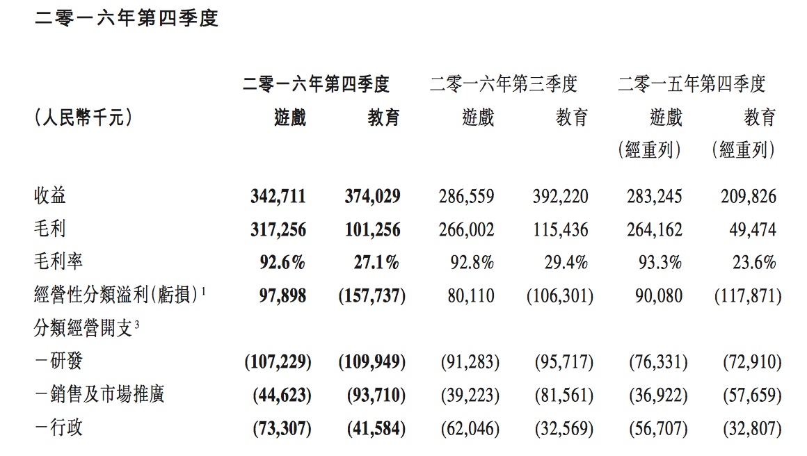網(wǎng)龍2016年Q4收益為人民幣7.4億元,其中來(lái)自教育業(yè)務(wù)的收益為人民幣3.74億元,來(lái)自教育業(yè)務(wù)的經(jīng)營(yíng)性分類(lèi)虧損為人民幣1.577億元。
