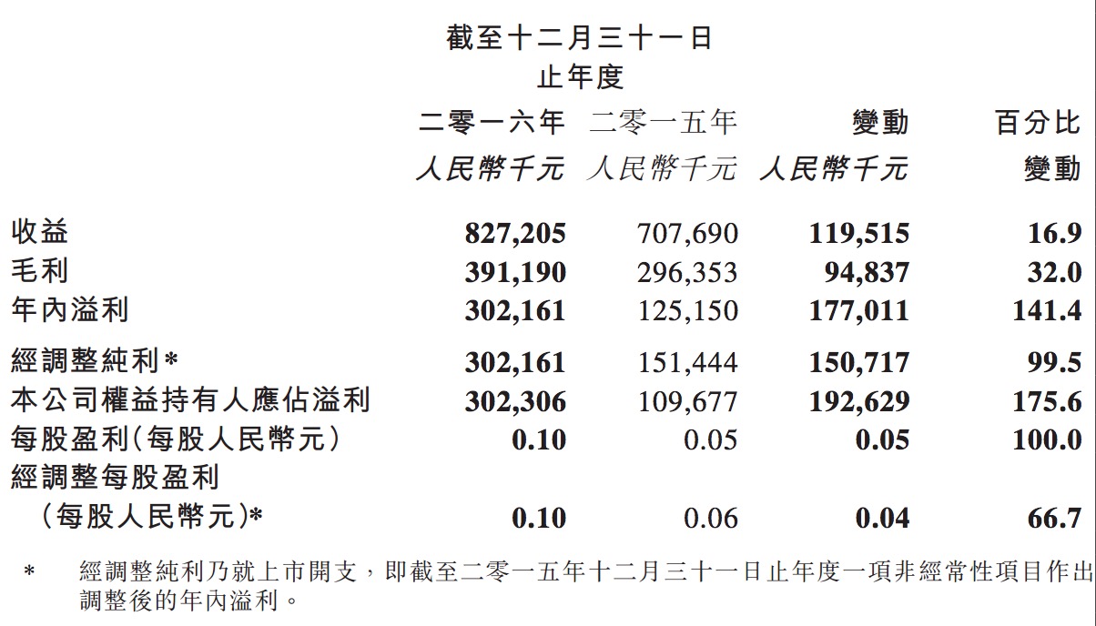 據(jù)公告顯示,成實外2016年總收益為8.27億元,比上年的7.08億元增長16.9%;毛利為3.91億元,比上年2.96億元增長32%;凈利潤為3.02億元,比上年1.25億元增長141.4%。