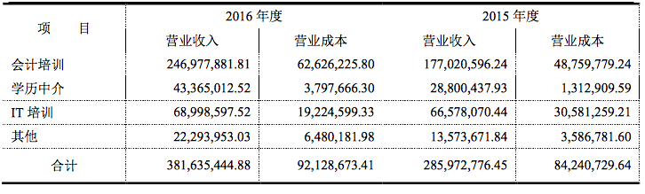 圖為恒企教育2015年、2016年各項(xiàng)業(yè)務(wù)營業(yè)收入