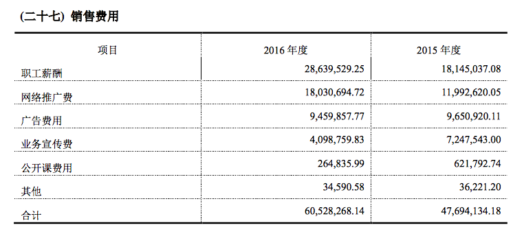 上圖為中大英才2015年、2016年銷售費(fèi)用