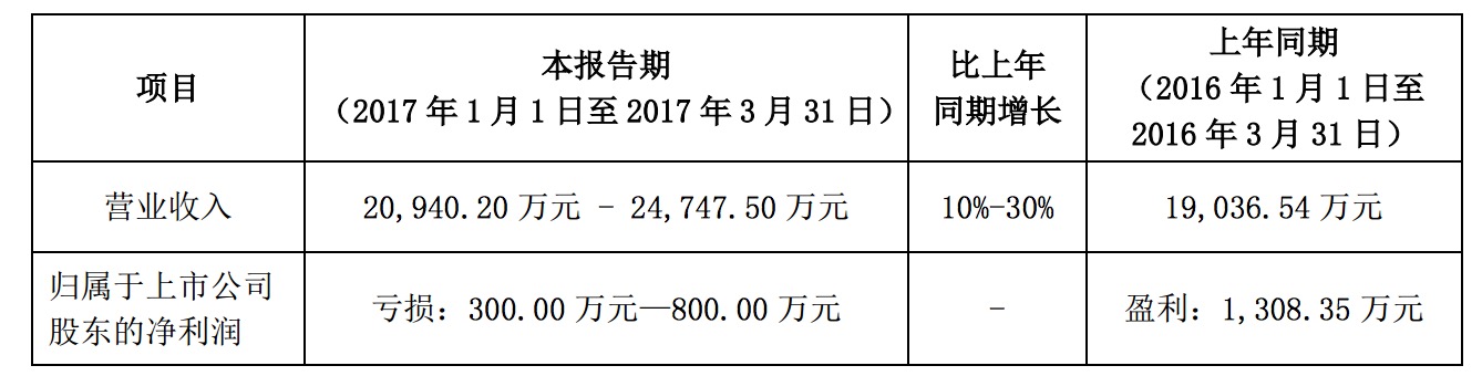 預(yù)告中顯示,全通教育2017年第一季度營業(yè)收入為2.09億元-2.47億元之間,比上年同期的1.90億元增長10%-30%;凈虧損300萬元-800萬元,比上年同期的凈利潤1308萬元大幅下降。