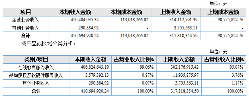 報(bào)告披露,在線教育服務(wù)收入4.06億元,占比99.06%,同比增長 34.63%,品牌授權(quán)及軟硬件服務(wù)收入357.94 萬元,占比0.87%,同比下降 70.01%。