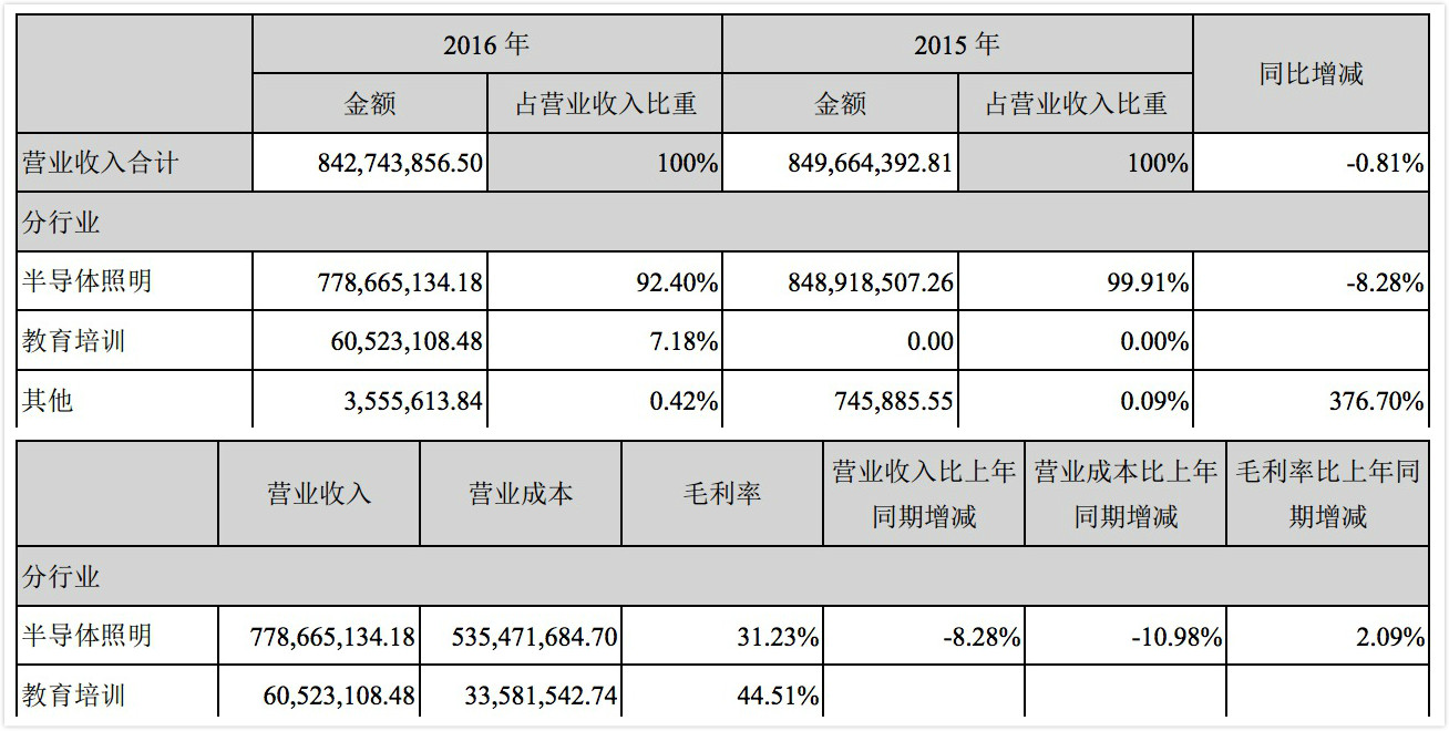報告表明,2016年勤上光電教育培訓營收6052.31萬元,占營業(yè)收入7.18%,營業(yè)成本3358.15萬元,毛利率44.51%。