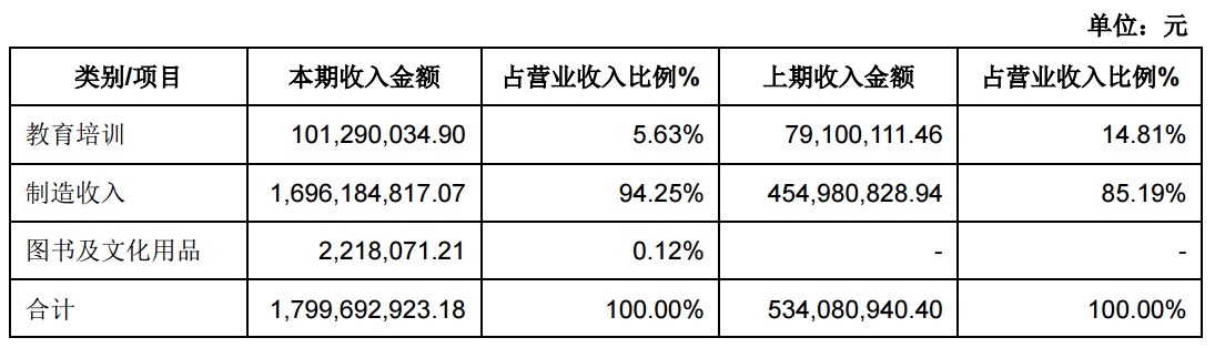 其中,制造收入16.96億元,占營收94.25%;教育培訓收入1.01億元,占營收5.63%;圖書及文化用品收入221.80萬元,占營收0.12%。制造收入為匯冠股份及其控股、參股企業(yè)主要業(yè)務。