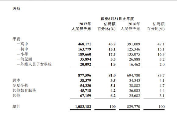 楓葉教育營收主要來自學費、向學生銷售及租出課本及其他教材、冬夏令營的收入、其他教育收入以及包括自營超市、提供校服等服務在內(nèi)的其他收入。根據(jù)報告,學費收入為87759.6萬元,占全部收入比例為81.02%,其他收入為20558.6萬元。2016-2017學年,楓葉教育每名學生平均學費為3.86萬元,高中所收取的學費為人民幣4.9-10萬元。