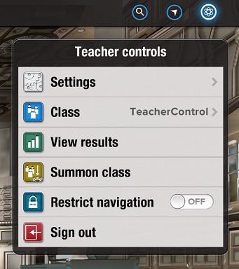 為了更好地保障學(xué)習(xí)效果,IntoScience強(qiáng)調(diào)老師在課堂中的主導(dǎo)地位。在老師控制界面,有查看成績(View results)、召喚班級(Summon class)、限制導(dǎo)航(Restrict nagivation)三個主要功能。通過View results,老師可以實時查看學(xué)生成績;為了所有學(xué)生都能參與進(jìn)來,老師可以使用Summon class,無論學(xué)生正在做什么,都會馬上回到指定活動;Restrict nagivation限制學(xué)生的活動區(qū)域,對他們的每一步行動進(jìn)行課程指引,保證他們進(jìn)入特定的學(xué)習(xí)領(lǐng)域。