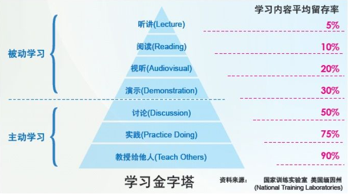 按圖中所述,講課時將聽講、閱讀、視聽和演示都運用上,也只能達到 30% 的留存率,也就是學過的內(nèi)容在一周后只記得 30%。這就是講課的效果——相反,主動學習最高可達到90%的留存率。