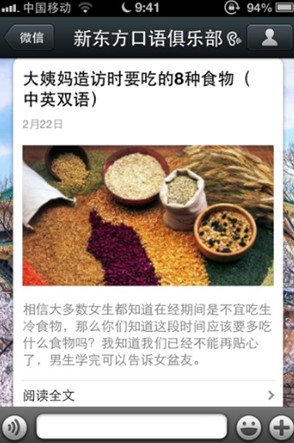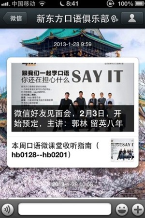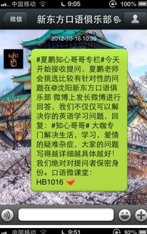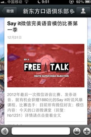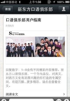 口語俱樂部這個公眾微信是我在2012年暑假結(jié)束后建立的,建立的原因是我覺得用微博的大學(xué)生其實沒有那么多,但是用微信的學(xué)生卻很多,官方微信到現(xiàn)在一年的時間,微信粉絲增加到了30000多人,我們每天給大家發(fā)送的各種口語內(nèi)容得到了學(xué)員很好的反饋,每天能收到幾千條的微信回復(fù),很好地培養(yǎng)了學(xué)員粘度。以下是我對如何做好語言學(xué)習(xí)類公眾微信的分析,案例都是我們口語俱樂部的例子,寫得不好的地方,請各位批評指正。