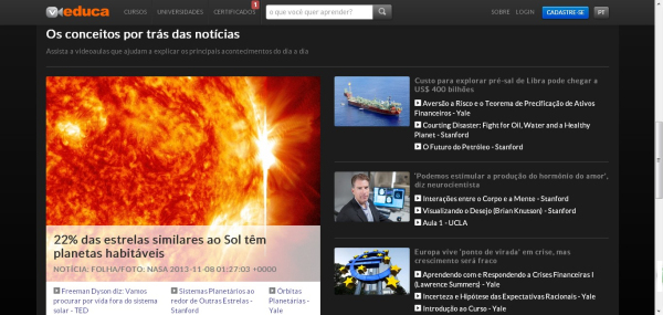 巴西網(wǎng)站Veduca的一大特色是首頁(yè)推薦和新聞熱點(diǎn)相關(guān)的課程。