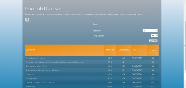 OpenupEd的課程建立在開(kāi)課大學(xué)自己的網(wǎng)站上,其中大多數(shù)是自適應(yīng)模式。課程按照學(xué)科和語(yǔ)言分類(lèi)。不管你學(xué)的語(yǔ)言有多么生僻,是阿拉伯語(yǔ)、波蘭語(yǔ)、斯洛伐克語(yǔ)還是希伯來(lái)語(yǔ),你都能在上面找到適合你的課程。許多課程還支持兩三種語(yǔ)言。