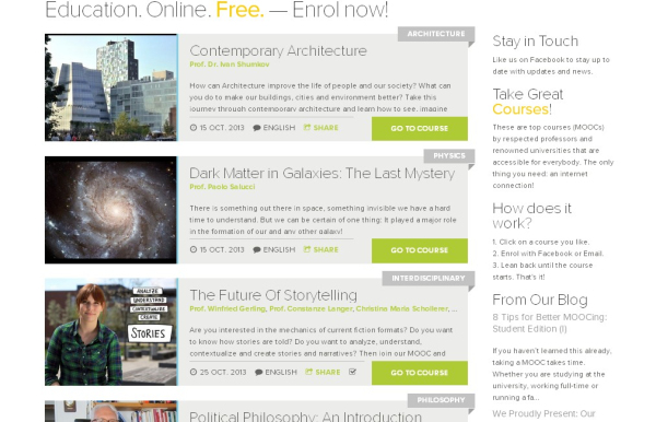 圖為iversity的部分課程列表,右邊欄顯示的是網(wǎng)站的線下聚會(huì)、博客文章等動(dòng)態(tài)。