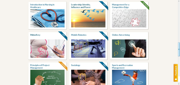 Open2Study的課程列表,課程右上角的小圖標(biāo)表示新課程(藍(lán)色)、推薦課程(橙色)或者自適應(yīng)課程(綠色)。