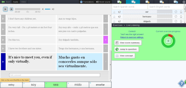 下圖是spanishmooc的聽(tīng)力練習(xí)頁(yè)面,左邊是音頻和聽(tīng)力材料,右邊是答題情況。右上角有電子詞典,并且聽(tīng)力材料中的每個(gè)單詞都可以點(diǎn)擊查看釋義。