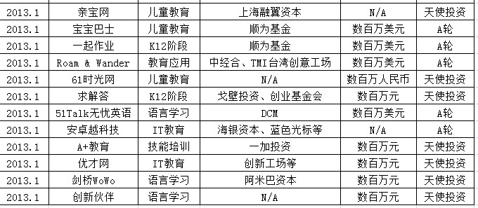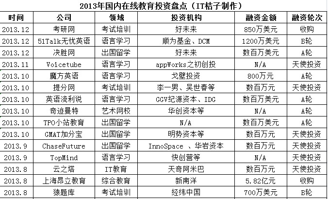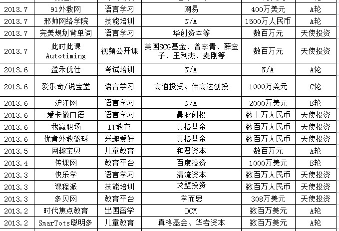 以下為2013年發(fā)生的在線教育類投資(IT桔子制表):
