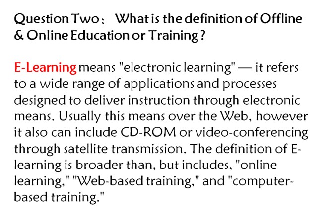 再進入第三個問題,”what’s the definition of offline and online education or training?”,在線教育能否顛覆傳統(tǒng)教育,我們會通過討論得出答案。在線教育是E-learning的一部分,是通過電子化的方式傳遞的一種教學(xué)方式。實際上,電視,計算機出現(xiàn)之后,就出現(xiàn)了所謂的線上教育。英國的Open University 早在上世紀(jì)70年代就用電視來遠(yuǎn)程授課了。那么它們是否能顛覆傳統(tǒng)教育呢?這么多年的實證結(jié)論是顛覆不了。線下教育和在線教育是一個雙贏的關(guān)系,無論在線教育的技術(shù)多么進步,這個技術(shù)本身只能夠讓學(xué)習(xí)者的效率提高。